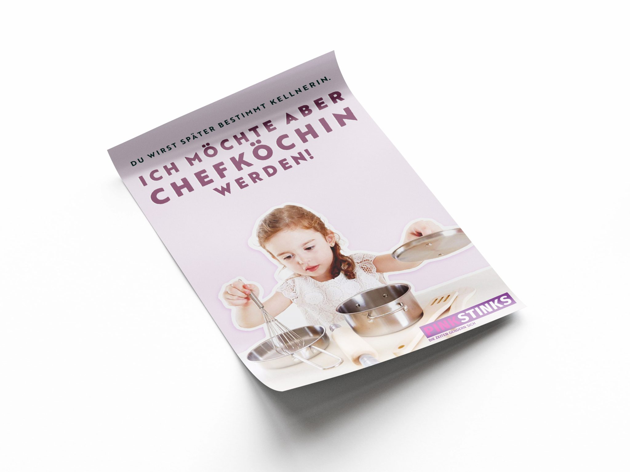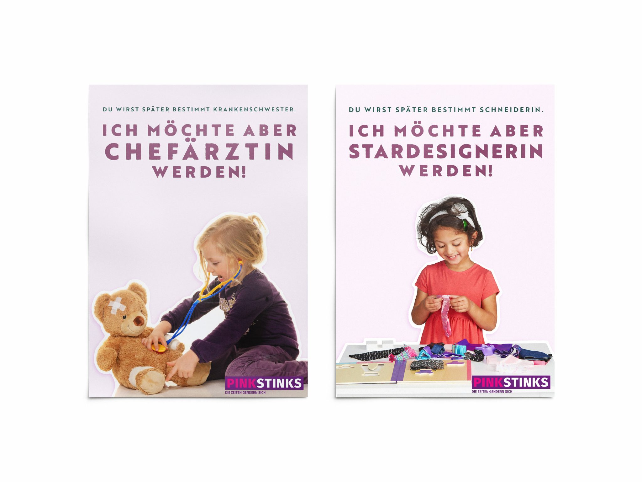 Eine fiktive Aufmerksamkeitskampagne von PinkStinks, einer Organisation, welche starre Geschlechterrollen herausfordert und sich somit für eine moderne und vielfältige Gesellschaft sowie einer Verringerung des Gender-Pay-Gaps einsetzt. Ziel der Kampagne ist es, Frauen den Zugang zu Positionen und Berufsfeldern zu ermöglichen, welche oftmals dem anderen Geschlecht zugeschrieben werden. Dem stehen heutzutage immer noch Vorurteile bezüglich der Fähigkeiten einer Frau im Wege, weshalb wir bei unserer Kampagne auf Aussagen trotzender Kinder zurück gegriffen haben.